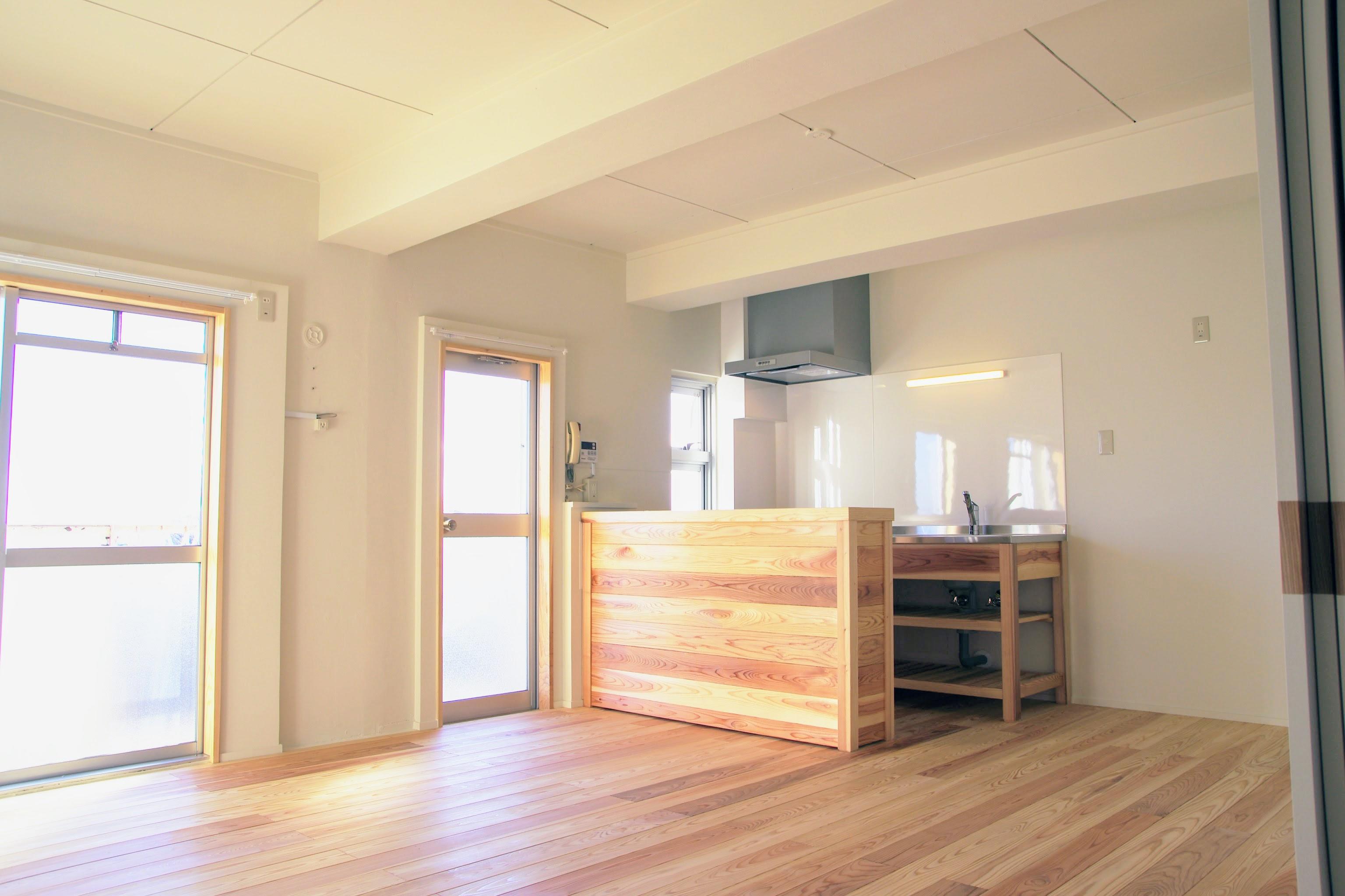 二宮団地(中郡二宮町)で行った公社オリジナルプラン「小田原杉のリノベーション」。入居率が6割を切っていた二宮団地で隣接する小田原市などの山で育った杉材を使ったプランを導入したのは2016年。厚さ25mmの小田原杉の無垢フローリング、小田原杉のオリジナルキッチンも採用した木質化リノベは大変な評判を呼び、とくに地区外からの移住検討者への効果的な訴求ツールとして機能しています。
